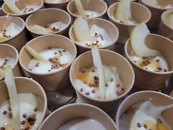 Dégustation Pour une expérience gustative complète, plongez la cuillère jusqu’au fond afin de mêler la douceur du Gwell, la richesse du miel et le croquant du sarrasin — puis croquez dans la pomme pour une note finale fraîche et acidulée.