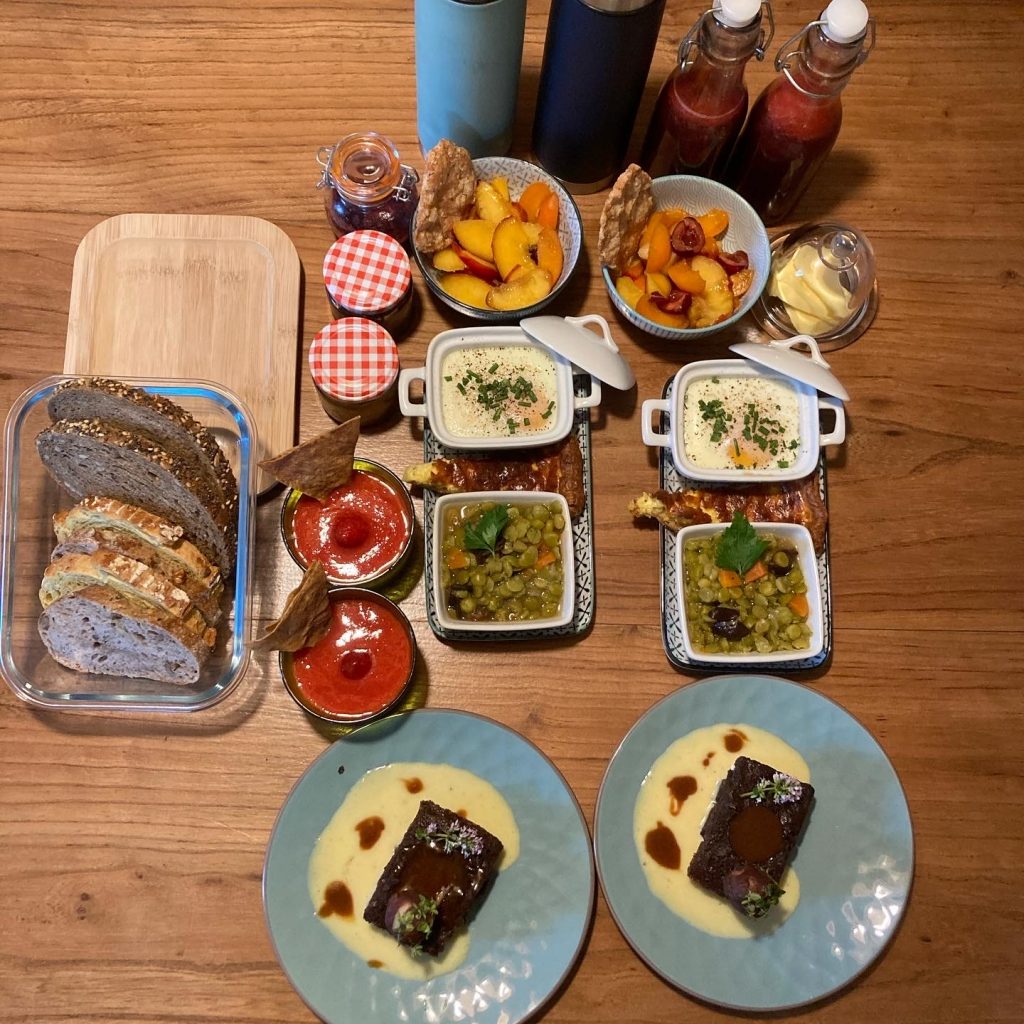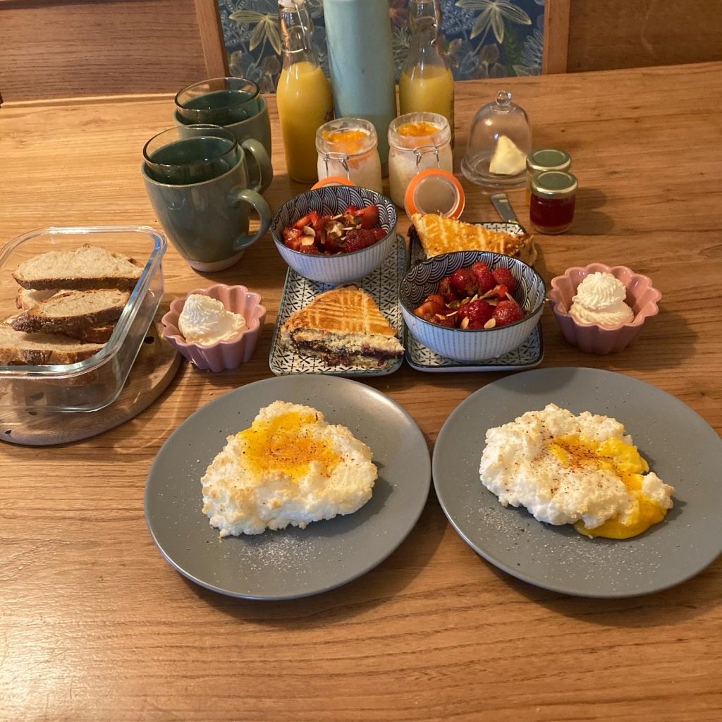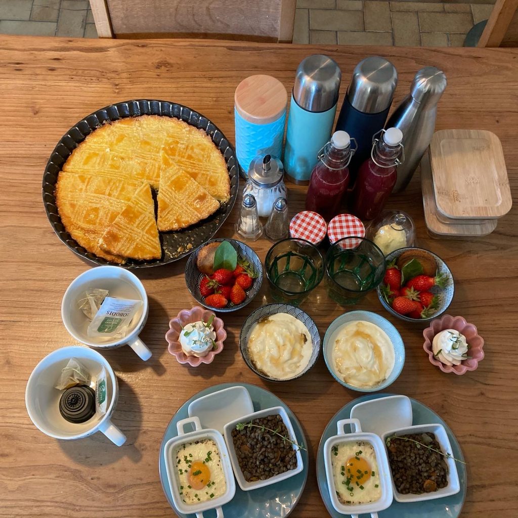 Suivant mes envies et les provisions disponibles vous pourrez déguster des spécialités locales telles que des crêpes bretonnes au beurre salé ou confitures, des galettes de sarrasin garnies de fromage et de charcuterie pour bien commencer la journée. Accompagnez le tout d’un jus fraîchement pressé, smoothies ou jus de pomme artisanal maison, d’un thé local ou d’un café fraîchement moulu pour une expérience authentiquement bretonne.