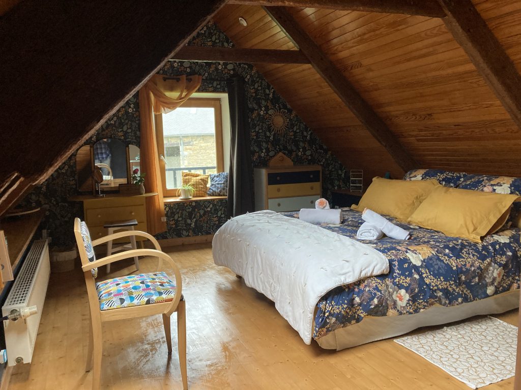 Un lit en 160, avec une literie neuve sommier à lattes, alèze, couette, draps et housse de couette récents, armoire penderie, commode, table de toilette avec miroir, fauteuil, le tout peint dans notre atelier de meubles peints…