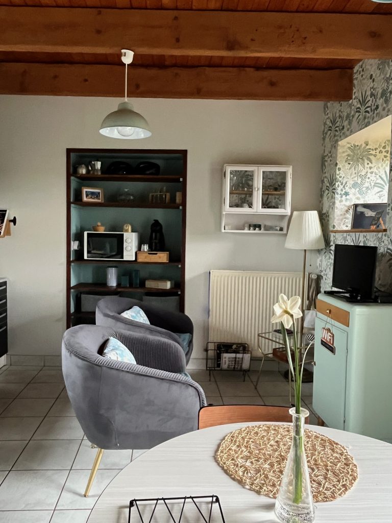 Le petit salon équipé de 2 fauteuils, d’un téléviseur écran plat HDMI, de jeux de société, cartes, cartes IGN, parapluie, lampe torche, parapluies…